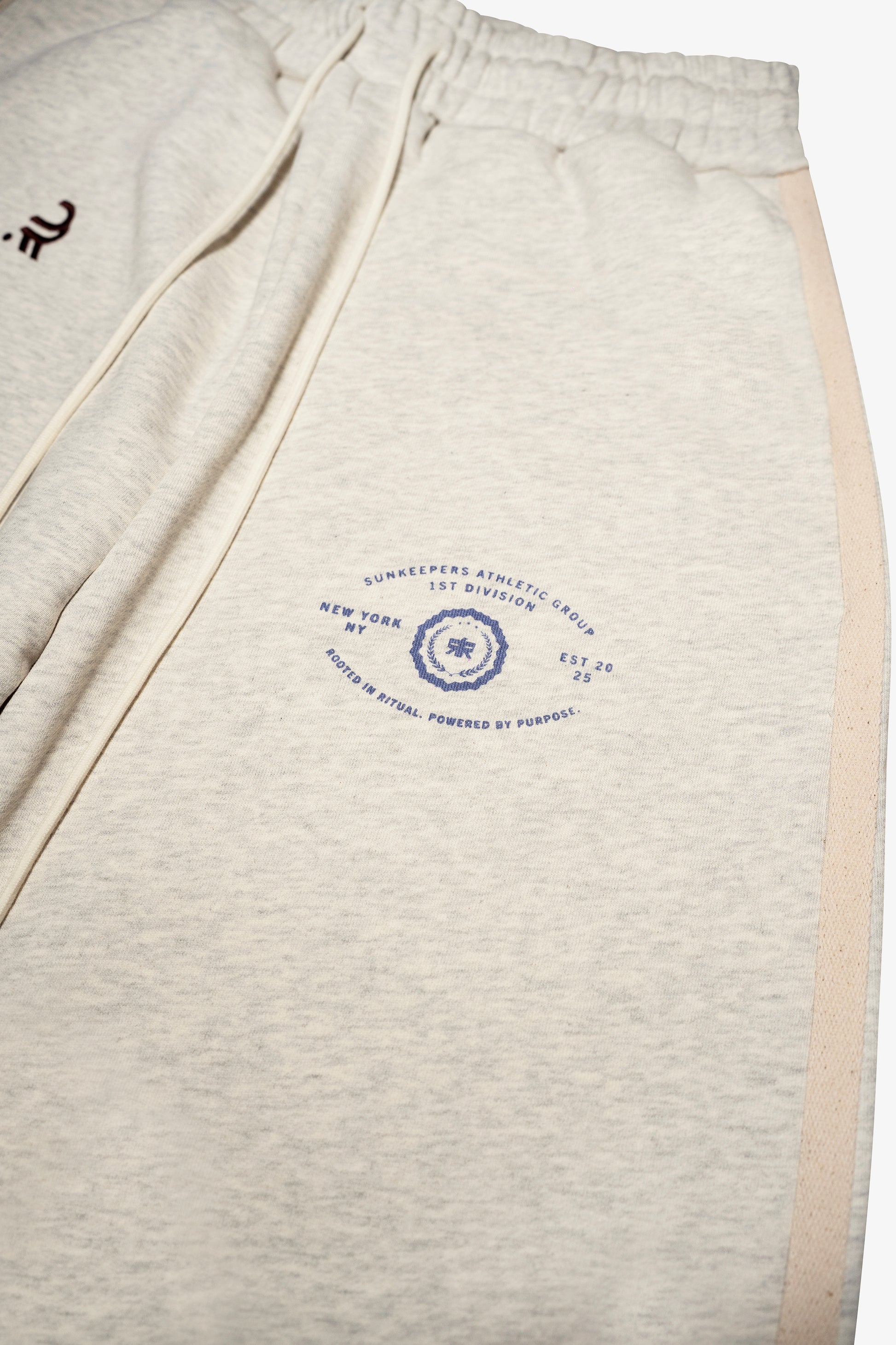 Crafted from 100% cotton French terry, the Sunkeepers Sweatpant offers structure with ease. The relaxed, wide-leg fit allows for natural movement, while the side stripe detail and adjustable ankle cinch give it a controlled, athletic finish.